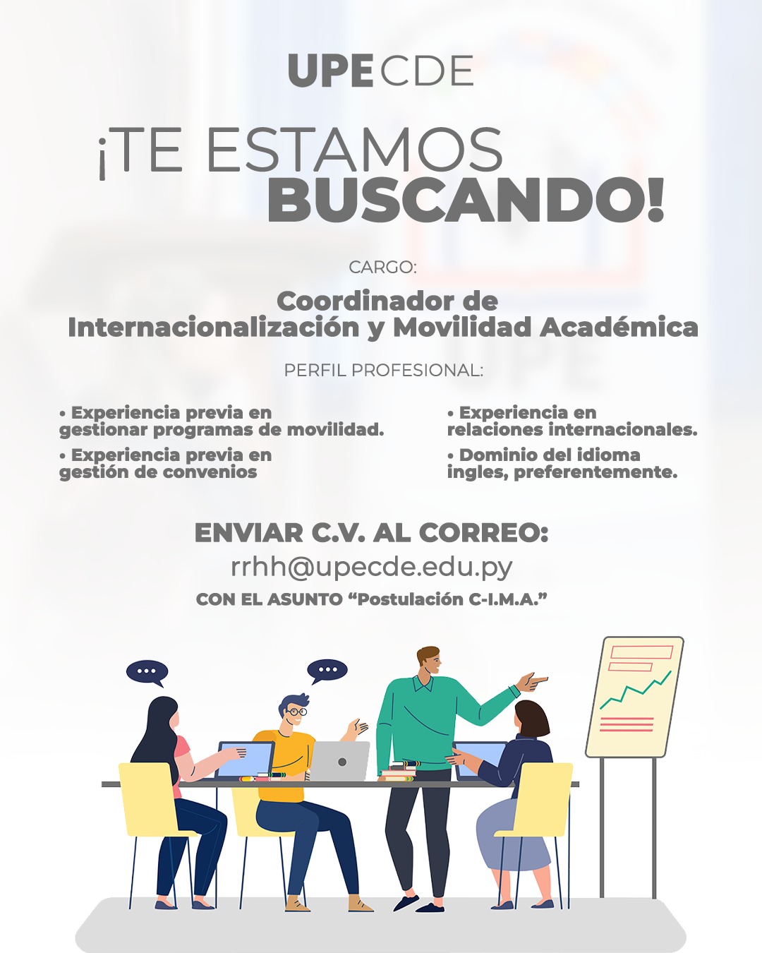 📩 Postulación: Los/as interesados/as deben enviar su Currículum Vitae al correo: rrhh@upecde.edu.py, con el asunto: “Postulación C-I.M.A.”.
