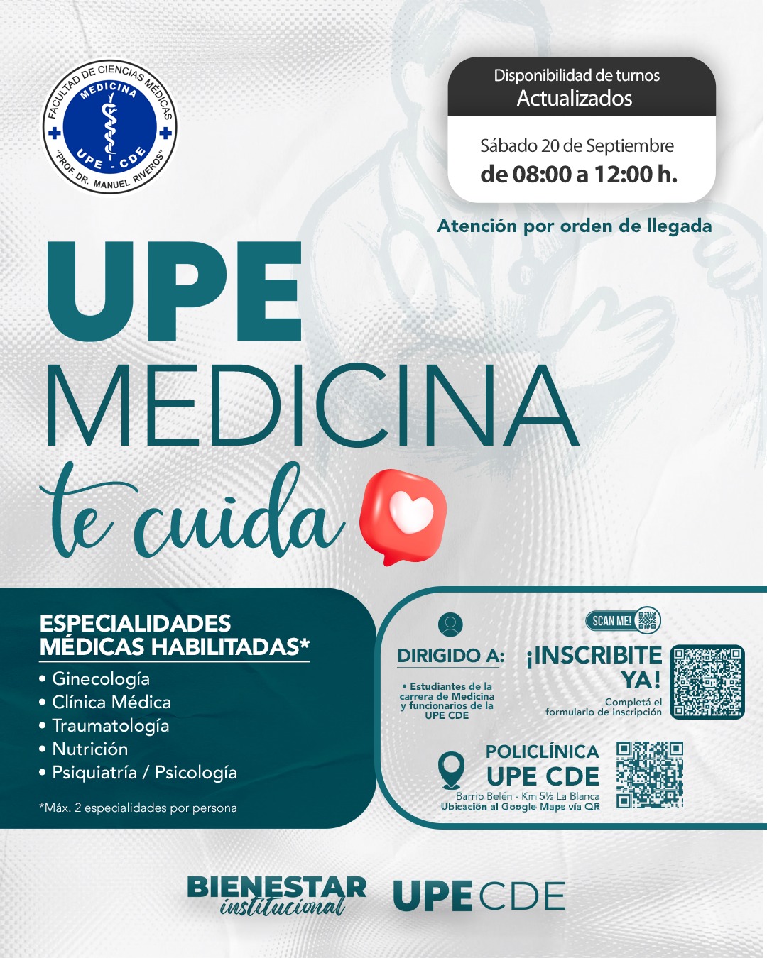 El evento se realizará el sábado 20 de septiembre, en la Policlínica UPE CDE, de 08:00 a 12:00 h, y tiene como objetivo promover la salud integral y el bienestar de la comunidad universitaria.
