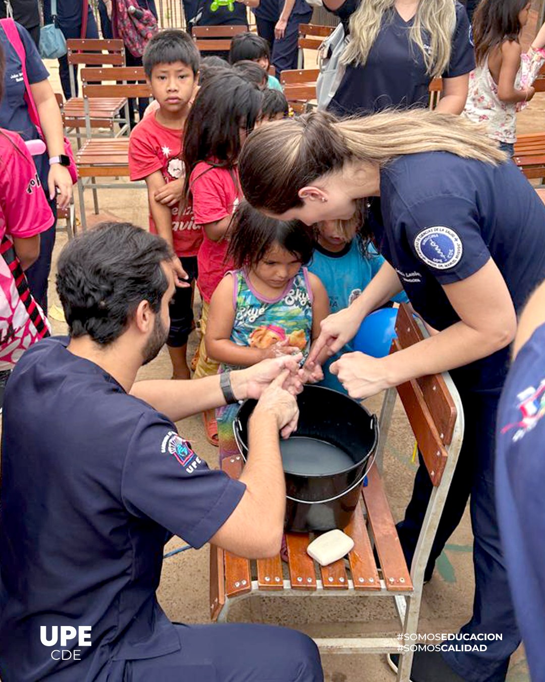 A través de jornadas educativas desarrolladas en instituciones como las escuelas Arandu Raity e Iva Viju Miri, los estudiantes de Medicina llevan adelante actividades dinámicas de concienciación sobre la importancia del correcto lavado de manos, considerado uno de los métodos más efectivos para prevenir enfermedades gastrointestinales, especialmente en la infancia. Las actividades se caracterizan por la interacción directa con los niños y niñas, el uso de materiales didácticos y el desarrollo de espacios lúdicos que facilitan el aprendizaje y la participación activa.