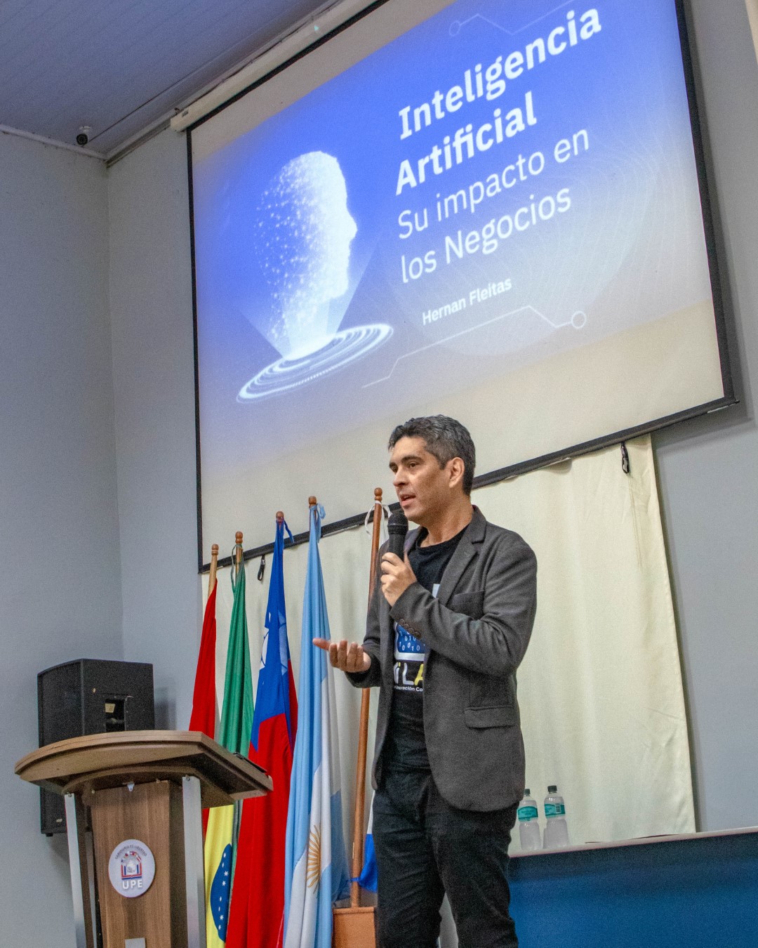 El invitado de esta jornada fue Hernán Fleitas, Analista de Sistemas y CEO de Mi Lab Hub de Innovación Colaborativo, NASA Space Apps Local Lead y Google Developers Local Lead, quien presentó la charla “Inteligencia Artificial en los Negocios”. Durante su exposición, compartió los avances más recientes de la IA, sus aplicaciones estratégicas en la administración, la informática y la comunicación, y motivó a los estudiantes a integrar estas herramientas de manera ética y responsable en su formación y futuro profesional.